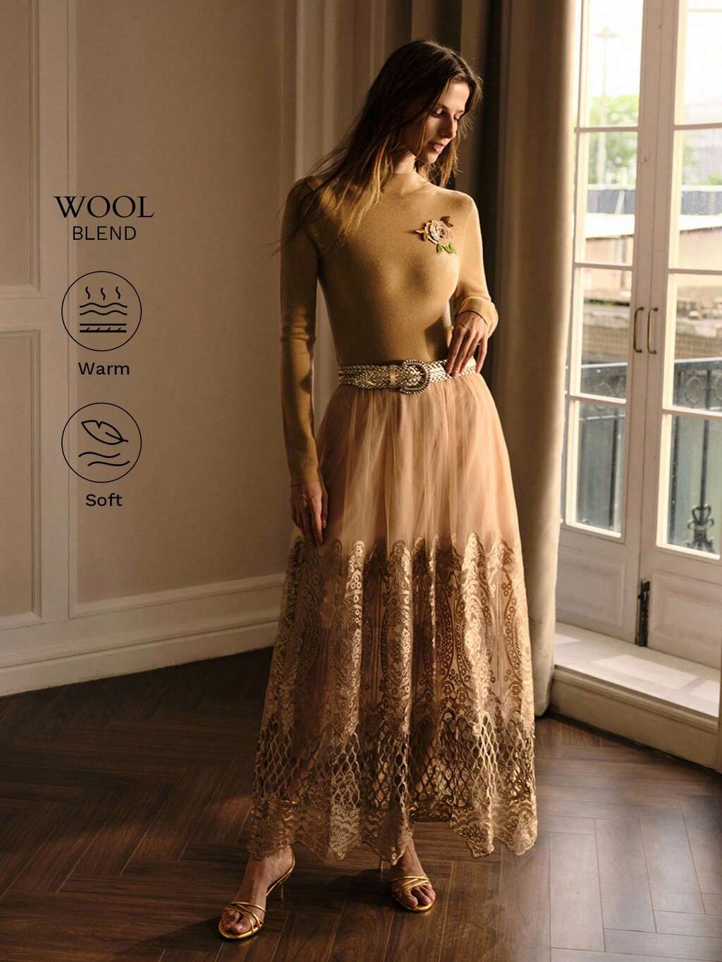 ROMANTYCZNA, ROZCIĄGLIWA, KORONKOWA SIATKA, MIĘKKA, TEKSTUROWANA, DŁUGA BLUZKA Z PRZEŹROCZYSTYM, WARSTWOWYM DOPASOWANIEM I PRZEŚWITĄ DZIANINĄ
