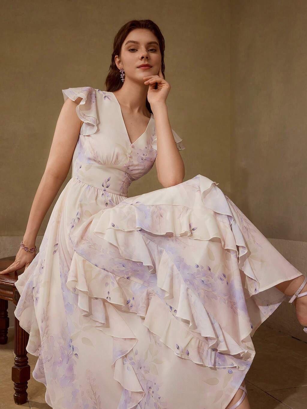 ZEYLAH Elegancka sukienka z długim rękawem i dekoltem w serek, z nadrukiem kwiatowym, sukienka wakacyjna, wiosna/lato