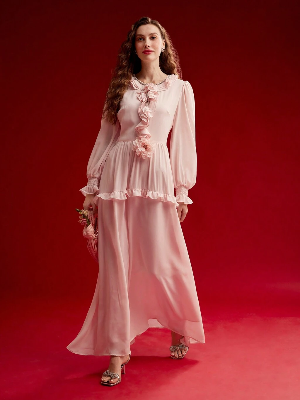 Sukienka z falbankami i rękawami w kształcie latarni, luźna, walentynkowa stylizacja, wiosna/lato