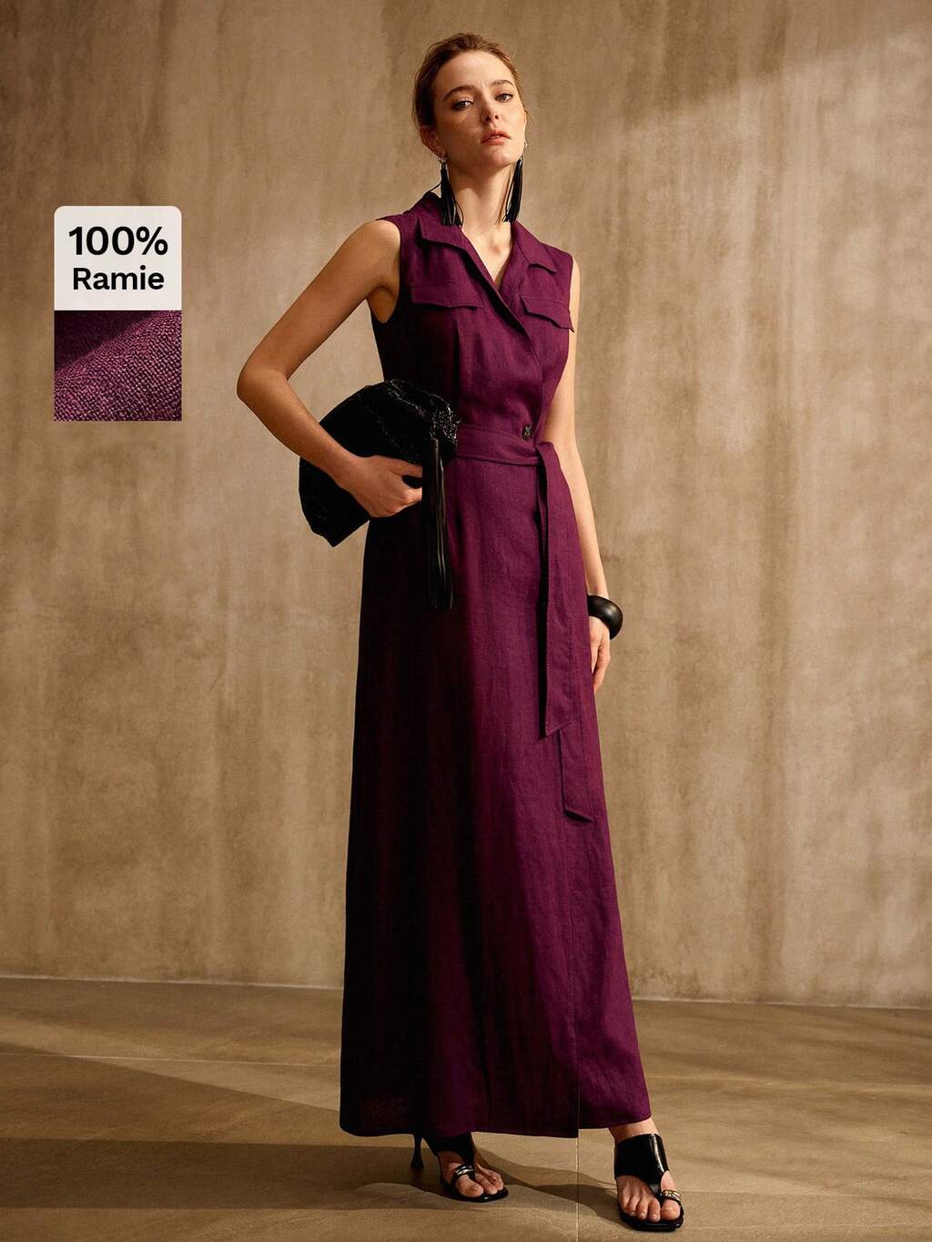 Vestido Utilitário Sem Mangas com Cinto de 100% Rami, Estilo Vintage Old Money, Primavera Verão