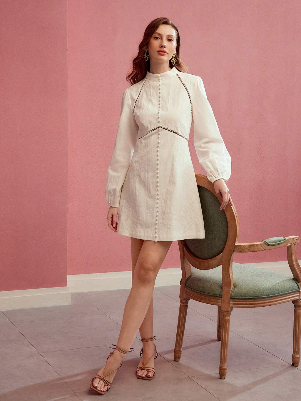 VESTIDO CURTO COM MANGA LANTERNA E RENDA CONTRASTANTE