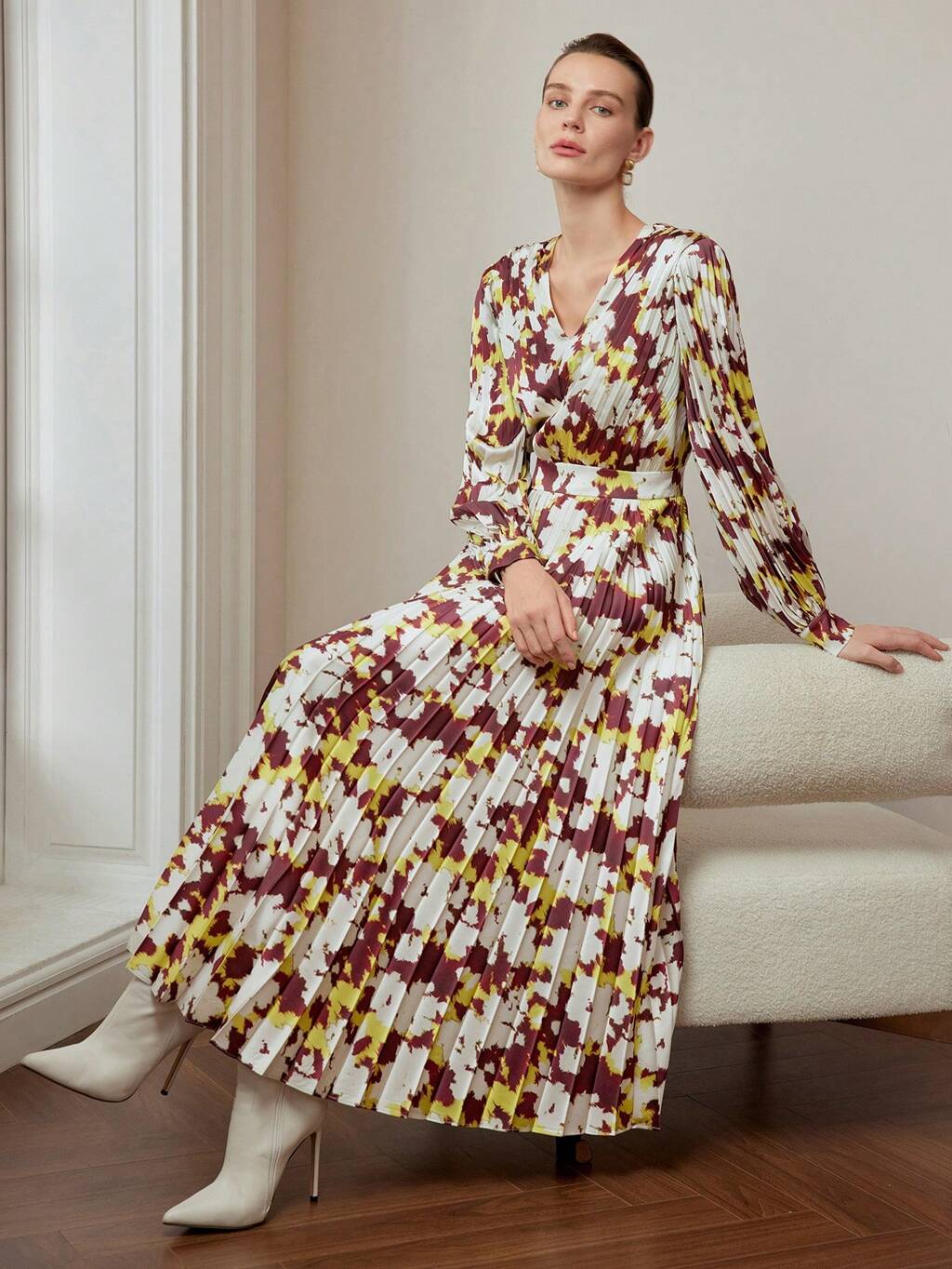 VESTIDO PLISSADO COM DECOTE EM V COM ESTAMPA TOTAL