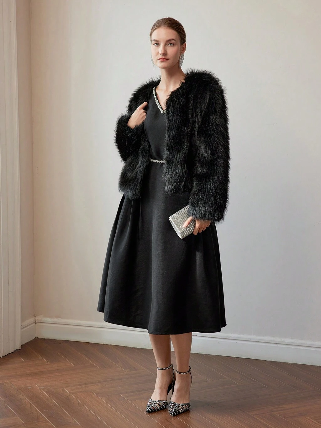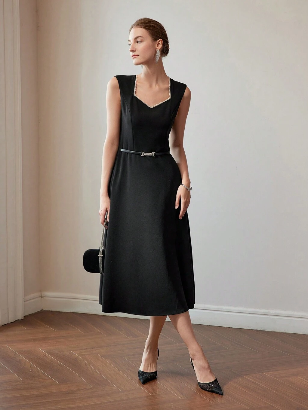 VESTIDO MIDI COM PREGAS DECOTE EM V SEM CINTO COM APLICAÇÃO DE LANTEJOULAS E PÉROLAS FALSAS