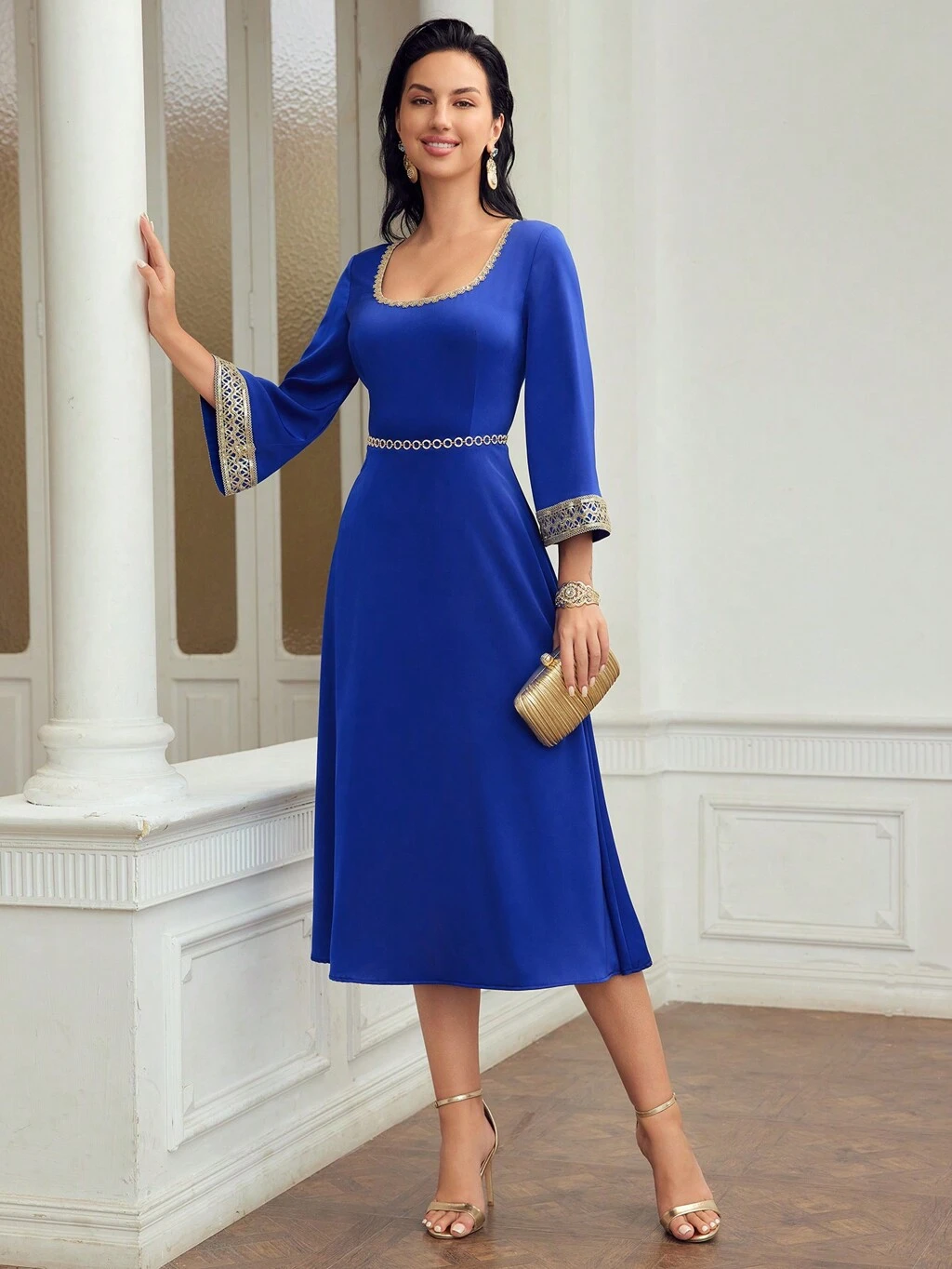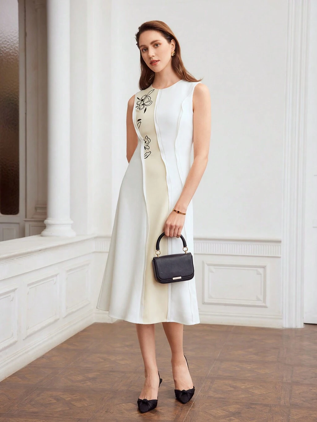 Vestido De Mangas Sino Bordado De Flores Feminino De Tecido Tecido Com Padrão De Bloco De Cor