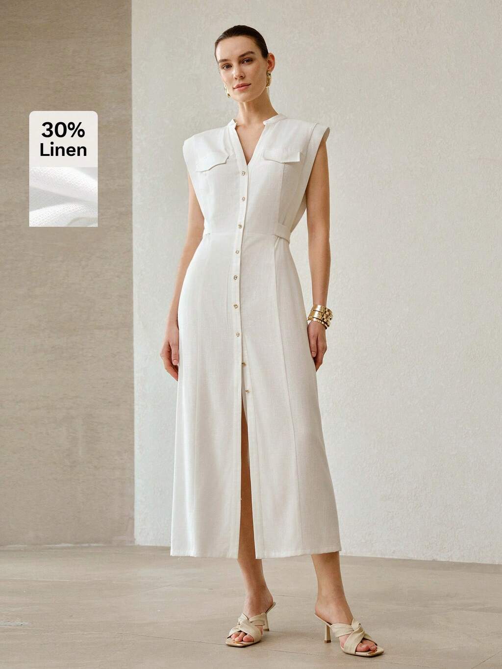 VESTIDO MIDI DE LINHO AJUSTÁVEL COM AMARRAÇÃO NA CINTURA E SEM MANGAS, DESIGN DA MODA PARA MULHERES