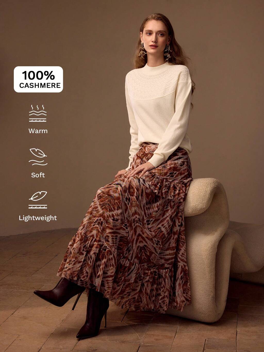 MOTF STUDIO Suéter de Tricô Canelado com Gola Alta Sólido 100% Cashmere