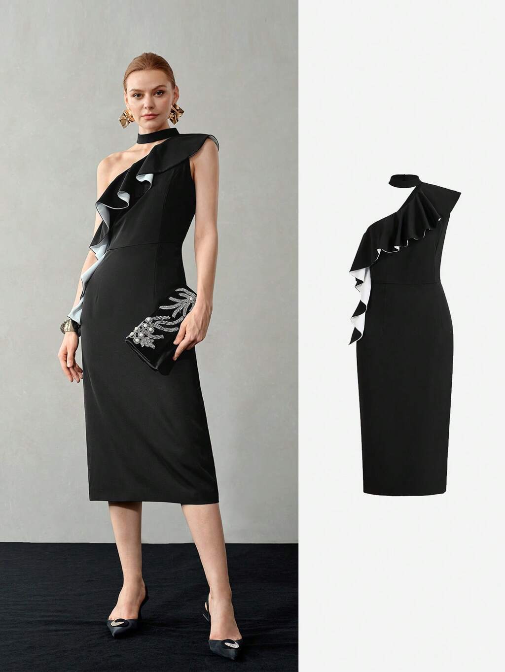 VESTIDO COM PREGAS DE BABADO NO OMBRO ASSIMÉTRICO