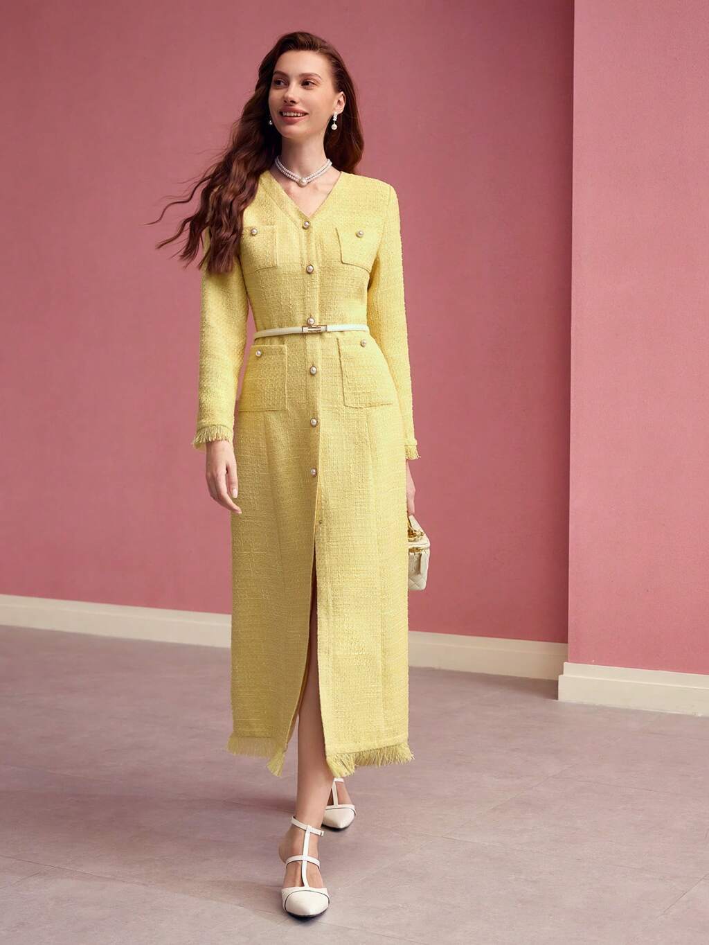 VESTIDO TWEED COM ACABAMENTO CRU E BOTÕES