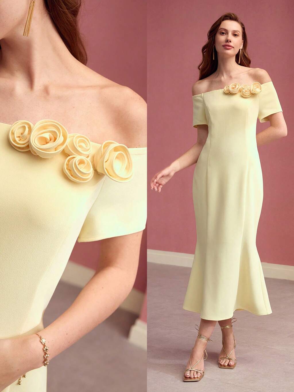 VESTIDO DE OMBRO CAÍDO FLORAL ESTÉREO, ROUPA PARA O DIA DOS NAMORADOS