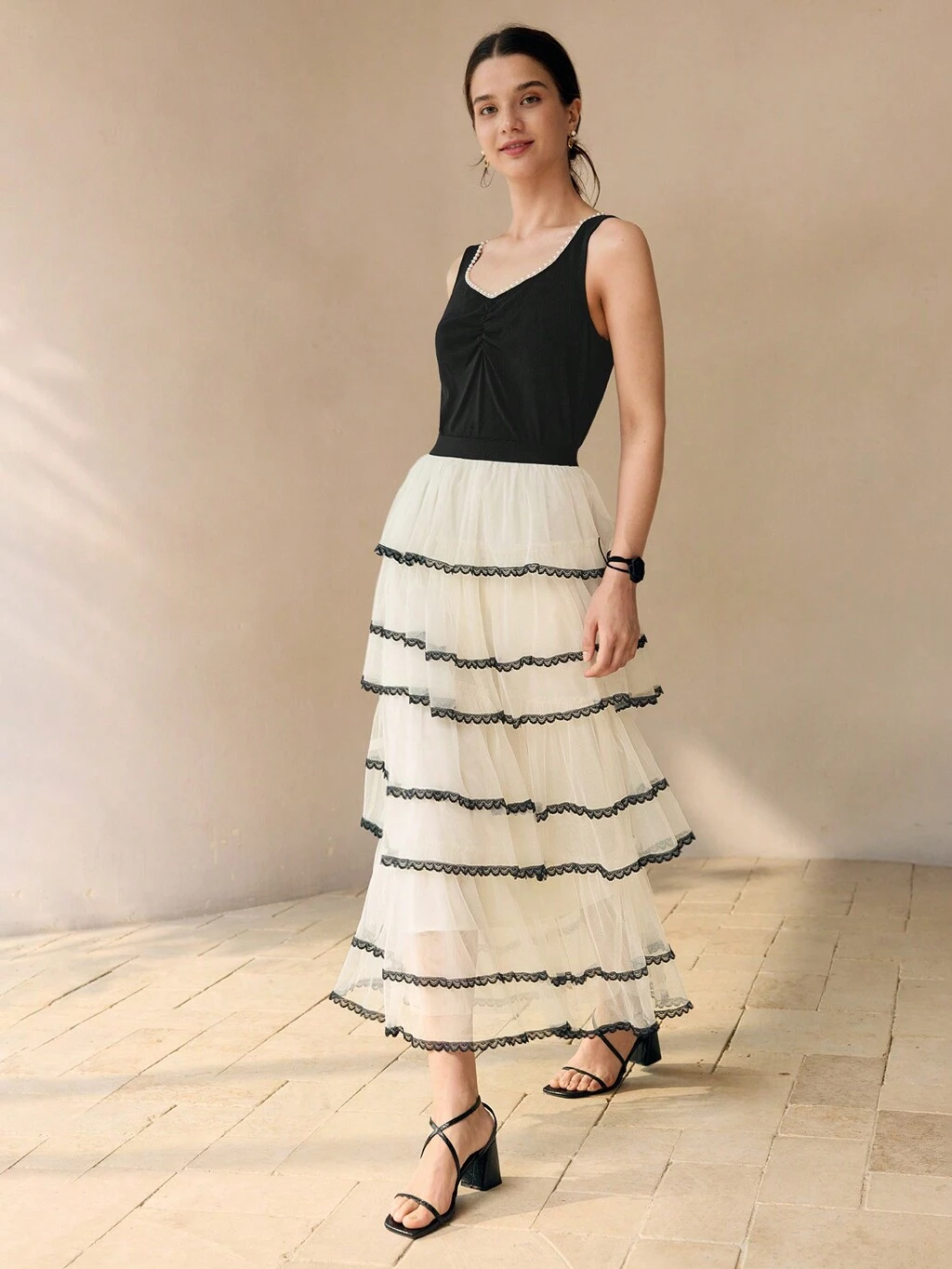 SAIA COM SOBREPOSIÇÃO DE TULE FLORAL E BAINHA ESCALONADA