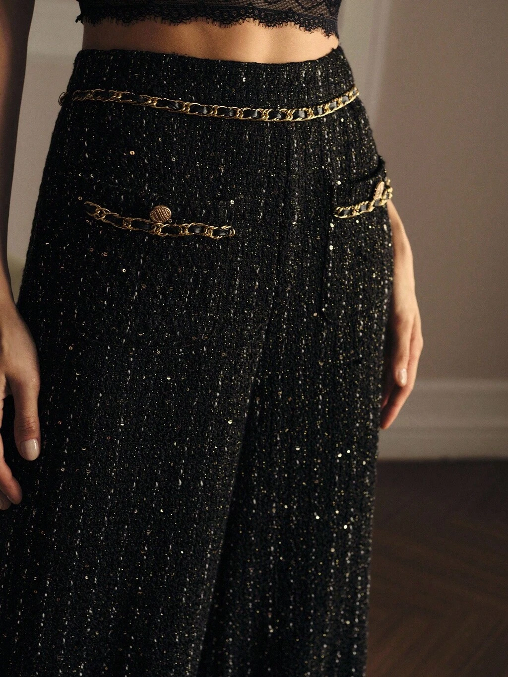 CALÇA PANTALONA COM BARRA DE CORRENTE DE LANTEJOULAS TWEED