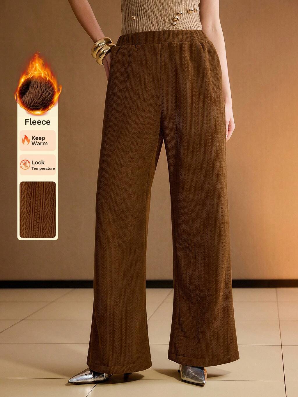 CALÇA DE PERNA LARGA COM CINTURA ELÁSTICA, BOLSOS INCLINADOS E TEXTURA SÓLIDA DE MALHA