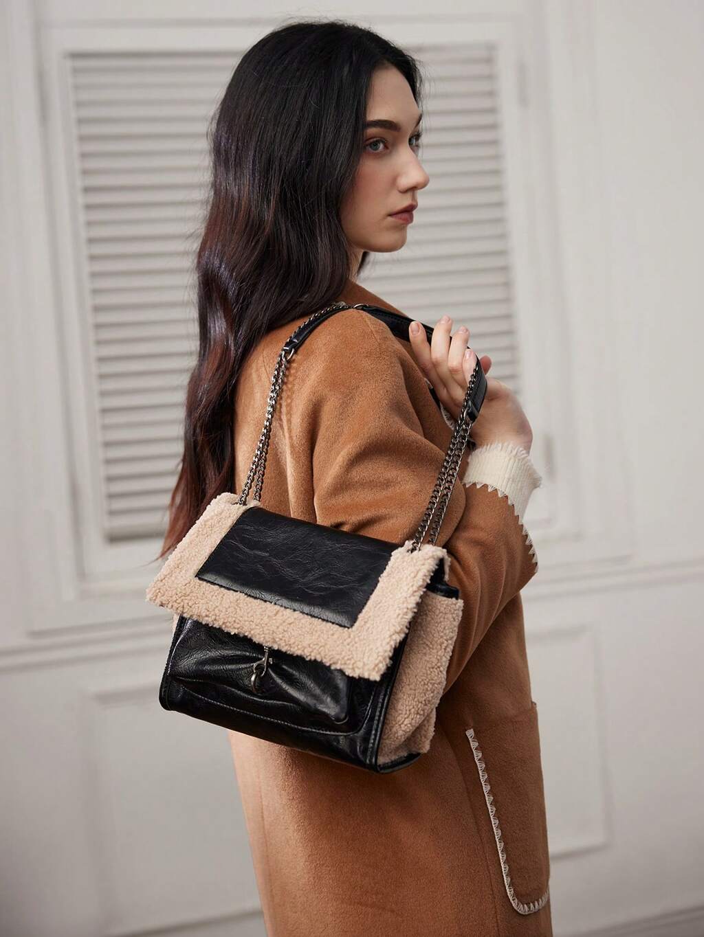 WOMEN'S FASHION PU LEATHER TEDDY PANEL FLAP SHOULDER BAG FOR COMMUTING