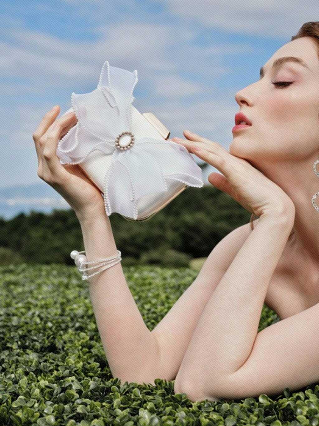 CLUTCH DE FESTA COM DECORAÇÃO DE LAÇO E PÉROLA FALSA