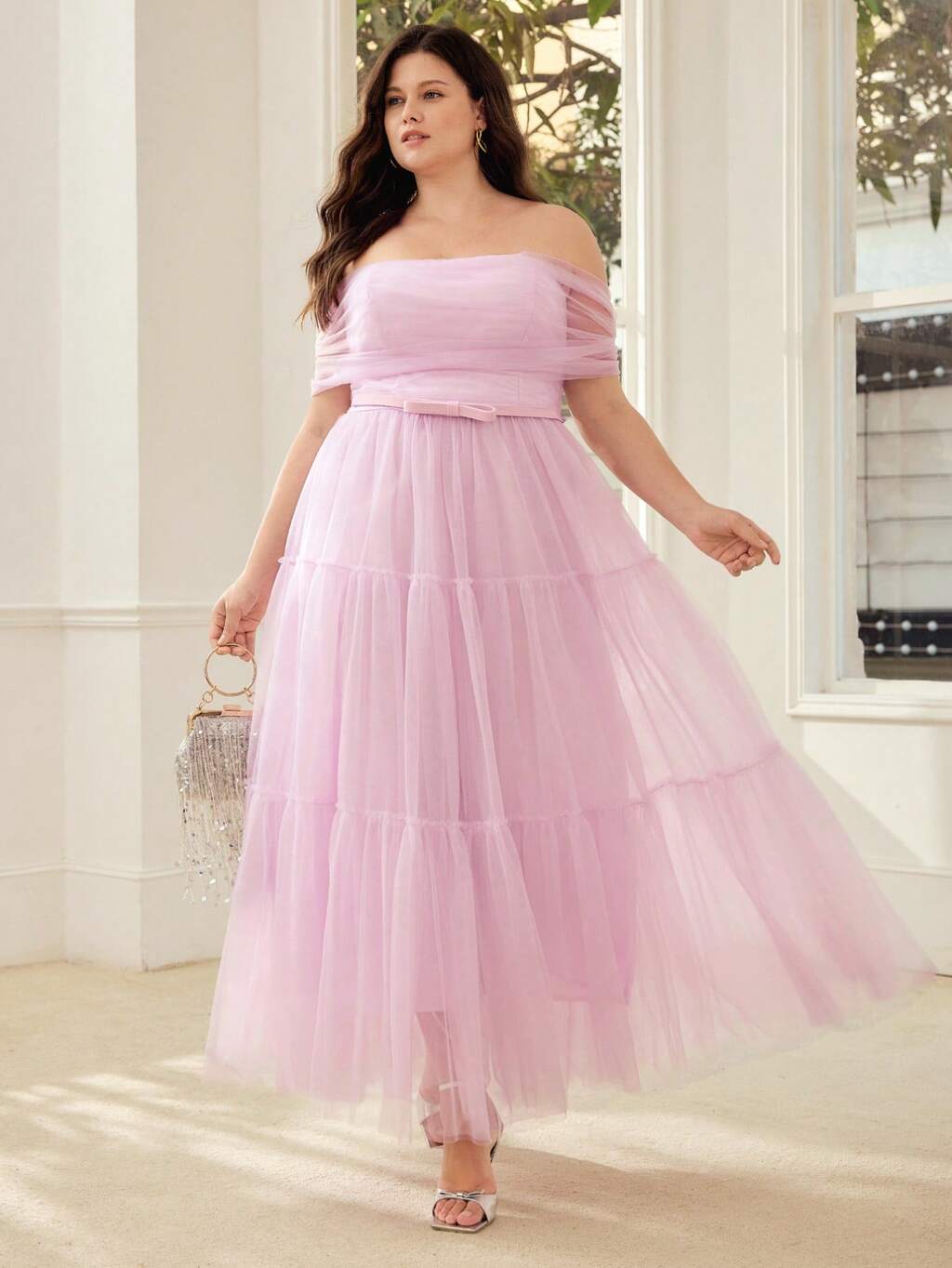 VESTIDO FORMAL ROSA DE MALHA FORA DO OMBRO PARA MULHERES PLUS SIZE, PRIMAVERA/VERÃO