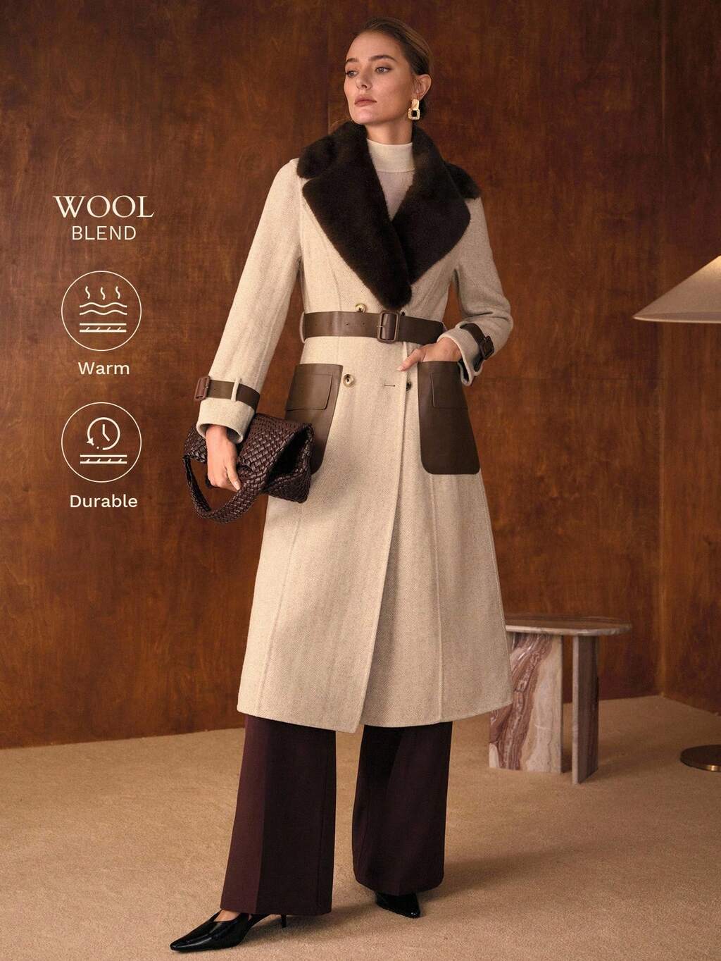 CASACO SOBRETUDO COM BOLSOS INCLINADOS, CINTO E CONTRASTE DE LÃ FELPUDA