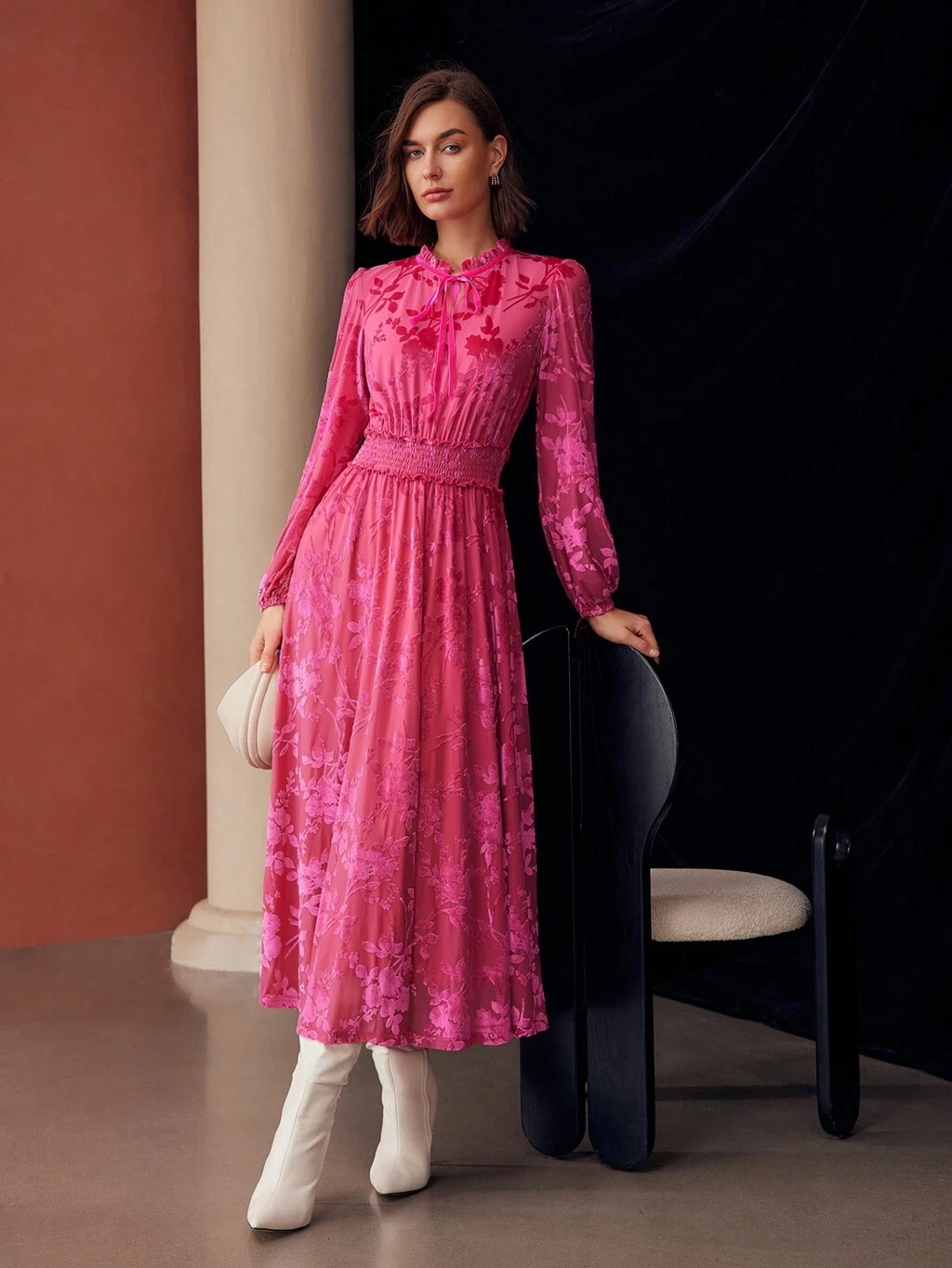 VELVET FLOWER JACQUARD FRILL TIE NECK LANTERN SLEEVE SHIRRED WAIST MIDI DRESS FOR HOLIDAY, PARTY CLOTHES, WOMEN OUTFIT